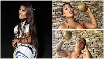 Fantana rocks swimwear in Ghana flag colours, pours coconut water on her, photos cause frenzy