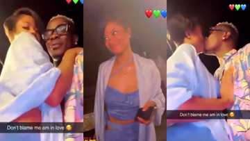 The duo appeared to be dancing slowly at what looked like an outdoor space of a hotel when they locked lips in a kiss while smiling at each other.