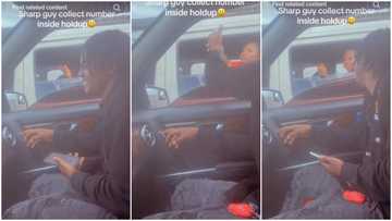 Man sitting in Benz collects lady's number in traffic, she collects his phone, quickly types it