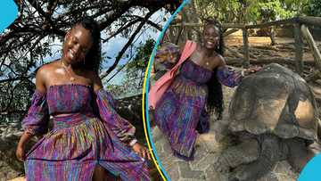 Afronita plays with giant tortoise in Zanzibar, flaunts well-oiled skin in African print outfit