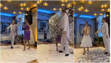 No be juju be that? Lady in purple gown transforms into white dress as silver particles rain on her in video