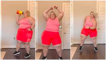 Plus-size white lady in red shorts gives sterling dance moves with legs apart in video; gets many reacting