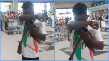 Ghanaian man cries at Kotoka airport as he readies to travel abroad, friend consoles him, video causes stir
