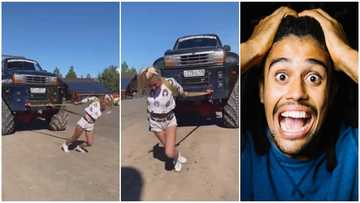 Strongest Obroni: White lady pulls gigantic car using ropes in incredible video, leaves many in disbelief