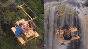 "Doing the most": Couple in love risk their lives to have romantic picnic over high waterfall; many react