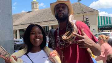 Fearless lady surprises, boldly poses with snake around her neck with tall man; photo stirs reactions