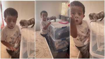 Little child scatters everything, pours baby powder on his face and dog, mum screams in funny video
