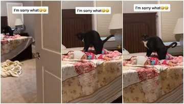 My grandma must not see this: Reactions as black cat stands on baby, massages kid's back in funny video